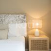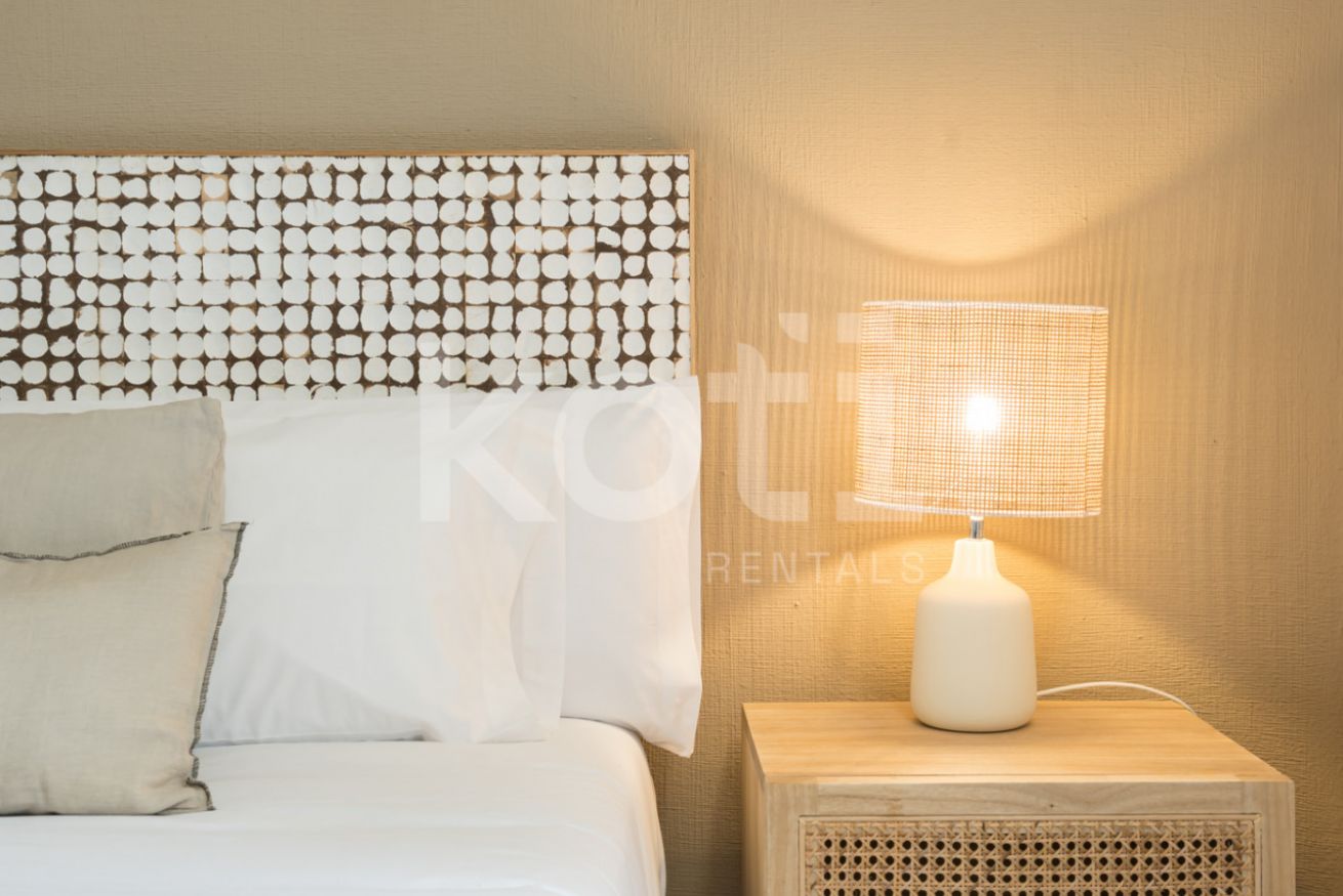 La villa, distribuida en una sola planta, cuenta con 186 m² construidos y capacidad para hasta 8 huéspedes. Dispone de tres dormitorios, todos con baño en suite, lo que aporta un alto nivel de privacidad. Dos de los dormitorios cuentan con camas dobles de 180x200, mientras que el tercero dispone de dos camas individuales. En el salón se encuentra además un sofá cama, ampliando la capacidad.