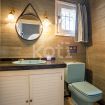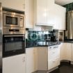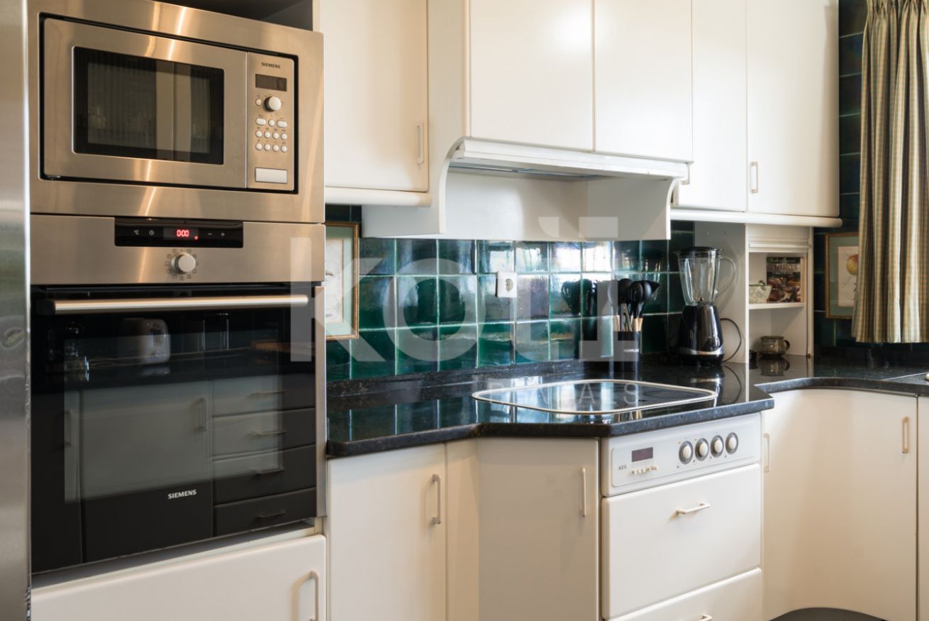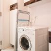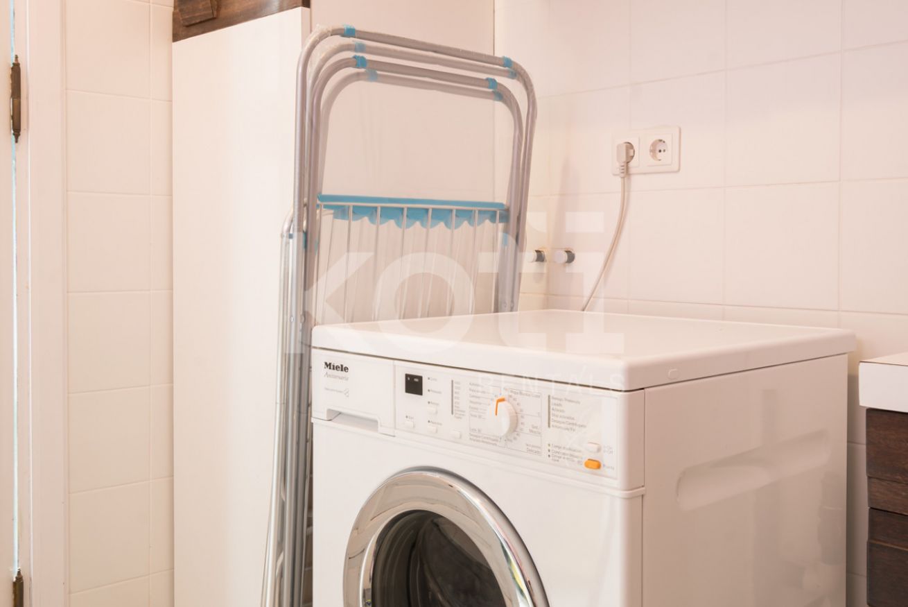 La cocina es independiente y funcional, equipada con horno, microondas y todo lo necesario para la estancia, además de una zona de lavandería con lavadora.