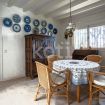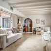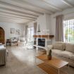 El salón es amplio y muy luminoso, con zonas diferenciadas de descanso y comedor, techos con vigas vistas y acceso directo al exterior, generando una conexión fluida con el jardín y la piscina.